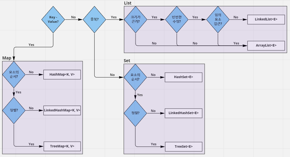 | Map | 키와 값의 쌍으로 저장, 순서 유지 X, 키는 중복 저장 불가 |
