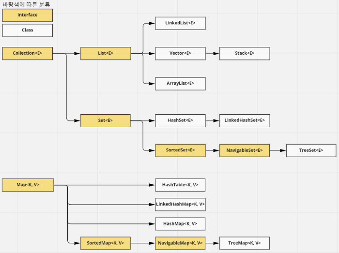컬렉션 프레임워크란 Java에서 다수의 데이터를 효과적으로 처리할 수 있는 표준화된 방법을 제공하는 클래스의 집합입니다. 즉, 데이터를 저장하는 자료 구조와 데이터를 처리하는 알고리즘을 구조화하여 클래스로 구현해 놓은 것이라 볼 수 있습니다. 자주 쓰이는 컬렉션 프레임워크의 클래스 구조도를 보면 아래의 이미지와 같습니다. (아래의 이미지에 나와있는 구조도는 간략화되어 있으며, 실제로는 훨씬 더 많고 복잡합니다.)